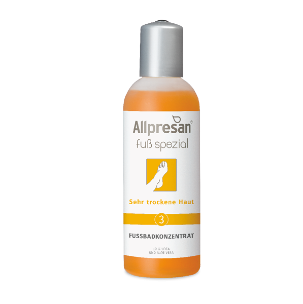 Allpresan pedicare 3 koncentrat za kopel za noge z 10 % uree in aloe vero je razvit specialno za potrebe zelo suhe kože. Nežno neguje kožo na stopalih, hkrati pa zagotavlja mehko vlaženje. Zaradi mehčalnega učinka se otiščanci, kurja očesa in trda koža občutno zmehčajo in jih je lažje odstraniti. Redna uporaba koncentrata za kopel za noge spodbuja zdravje in dobro počutje stopal.