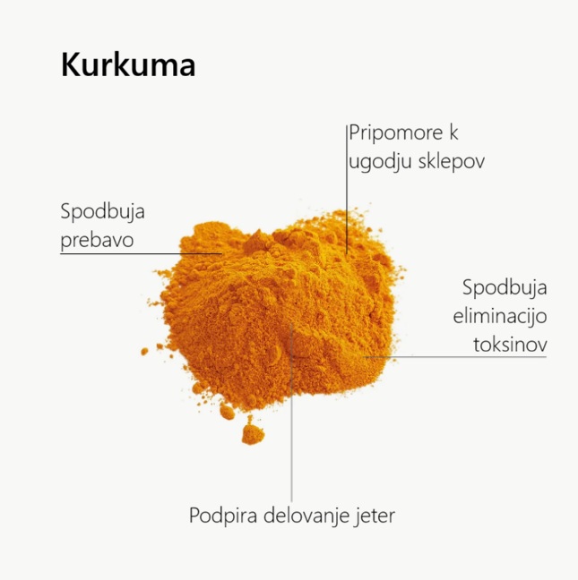 Formula temelji na kurkumi, rastlinski sestavini, ki je tradicionalno uporabljena kot del uravnotežene prehrane. Dopolnjujeta jo L-teanin in L-triptofan, funkcionalni aminokislini, ki sodelujeta v presnovnih procesih, povezanih z delovanjem živčnega sistema in dobrim počutjem.